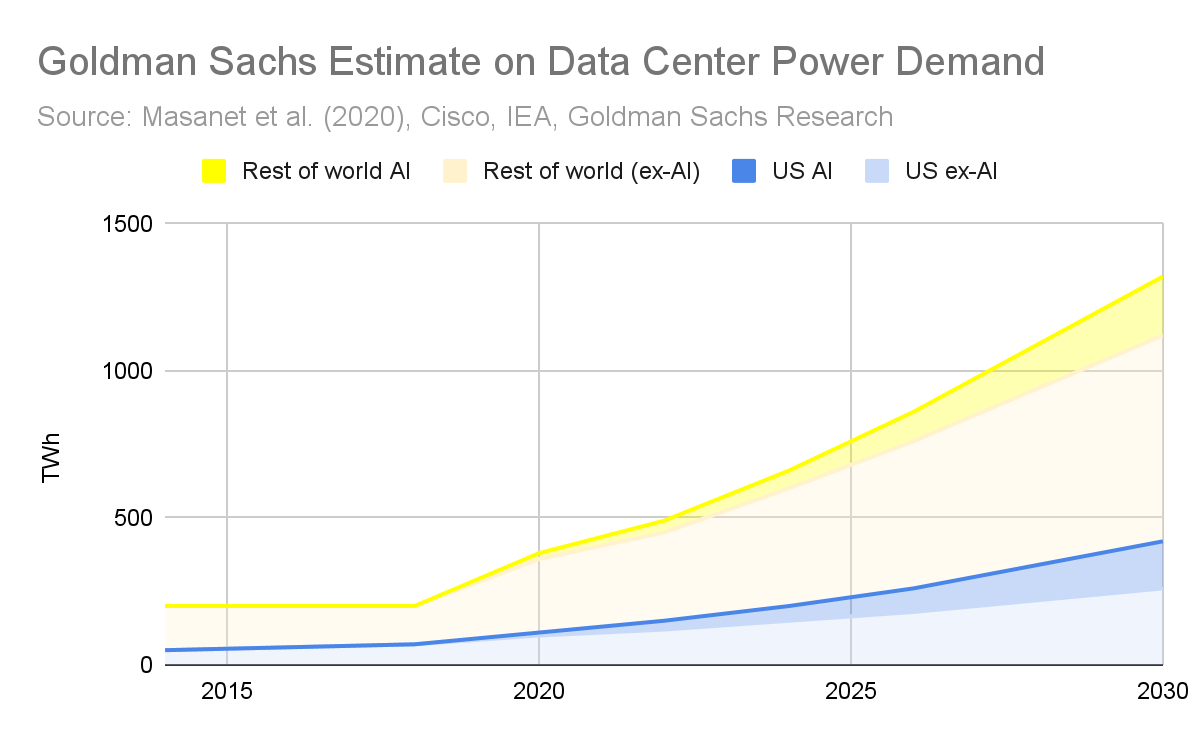 Goldman Sachs Research estimates that data center power demand will grow 160% by 2030, with AI representing about 19% of this demand by 2028.