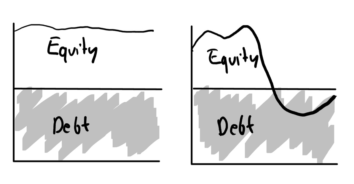 By combining both concepts, the company must not cross the bottom line in order to avoid bankruptcy. The financial structure must be so that its value doesn’t wall below the equity and into the debt. While “naive and far-from technically correct terms”, when the amount of debt exceeds the value of the company, it is insolvent.